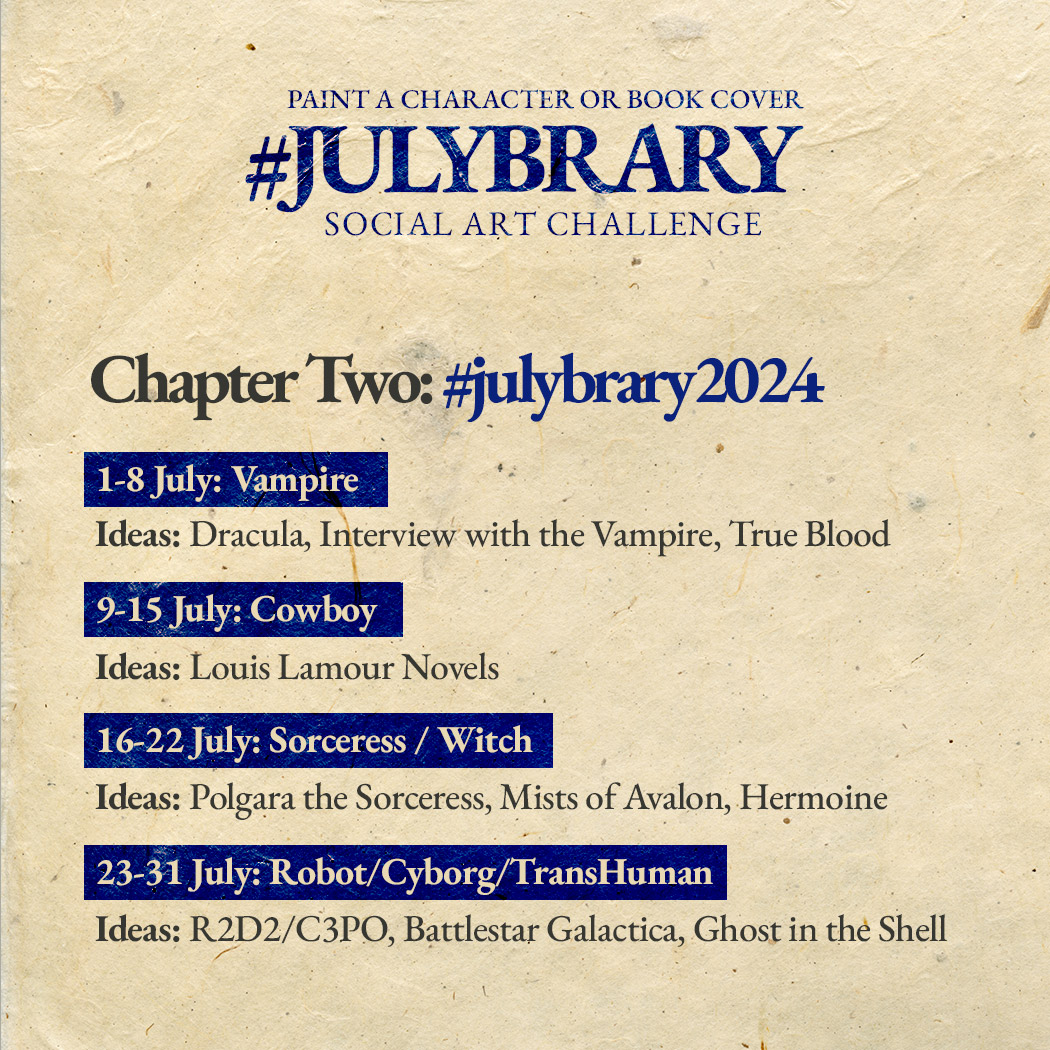 That’s why, I’ve set the goal for #julybrary to be a weekly art challenge, rather than daily. Even if you have the time to do a daily drawing, you might consider instead do a better weekly drawing. Just spend more time polishing your work and really growing as an artist. You also decide how much you want to sweat over each creation – a portrait, a bust, a full figure, a whole scene⦠or go full tilt and create a mock book cover. The only rule is that you put in actual creative effort (i.e. no ai/generated art). This challenge is for humans.